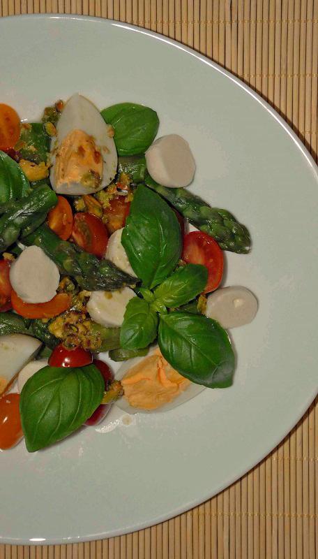 Dziś ta sztuka właśnie mi się udała. Ponieważ sezon szparagowy ciągle trwa (oby jak najdłużej) przygotowałam sałatkę ze szparagami. Połączyłam je z pomidorkami koktajlowymi, świeżą bazylią serem mozzarella i jajkami. Całe danie zrobił jeden dodatek: cytrynowo pistacjowy sos. To była pierwsza sałatka do której go przygotowałam ale już dziś wiem, że z pewnością nie ostatnia.