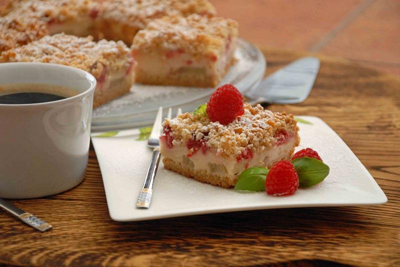 Kruche ciasto z rabarbarem, budyniem i malinami