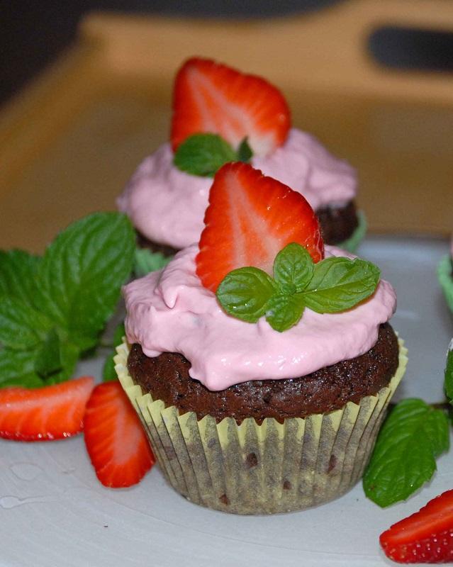 Dziś propozycja deseru czekoladowo-truskawkowego: pyszne mięciutkie babeczki czekoladowe truskawkowym serkiem i truskawkową niespodzianką w środku. Czy ktoś może im się oprzeć?