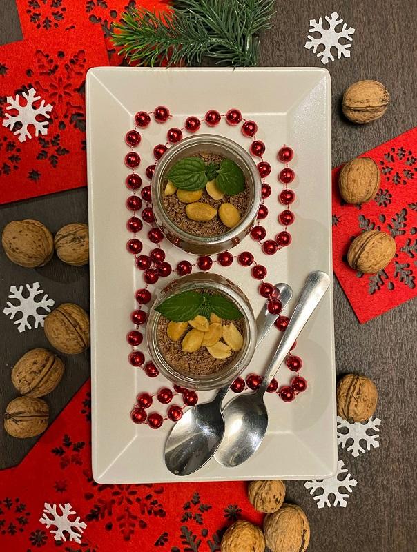 Zwykle gotuję dla całej rodziny. Czasem przygotowuję coś, co dzieci szczególnie lubią, bo my dorośli łatwiej się dostosujemy i „lubimy" wszystko. Tym razem jednak zrobiłam odstępstwo od reguły i przygotowałam deser dla dorosłych. Lekki jak piórko orzechowy mus podałam z doskonałym zimowym piernikowym likierem i gorzką czekoladą. Deser ten w bardzo prosty sposób można przerobić na wersję dla wszystkich. Wystarczy likier piernikowy zastąpić owocami lub polewą czekoladową. Likier piernikowy koniecznie przygotujcie sobie trochę wcześniej. Jest doskonały do leniwego popijania zimowym wieczorem lub jako dodatek do deserów i lodów dla dorosłych.