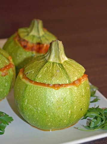 Jesień to czas cudownych zbiorów. Papryki cukinie, bakłażany, patisony. Wszystko świeże, kolorowe, jędrne, aż chce się jeść. Moimi ulubionymi warzywami do przeróbek są cukinie. Zawsze robiłam faszerowane długie łódeczki, ale niedawno na targu pani sprzedająca dary ogrodu poleciła mi do faszerowania cukinie okrągłe. Rzeczywiście okazało się, że do faszerowania są znakomite. Mięsiste, pięknie udaje się wydrążyć środek i po upieczeniu wyglądają o niebo lepiej niż te długie. W zależności od potrzeb i zasobów w lodówce robię dwie wersje faszerowanych cukinii mięsną i bez mięsa.