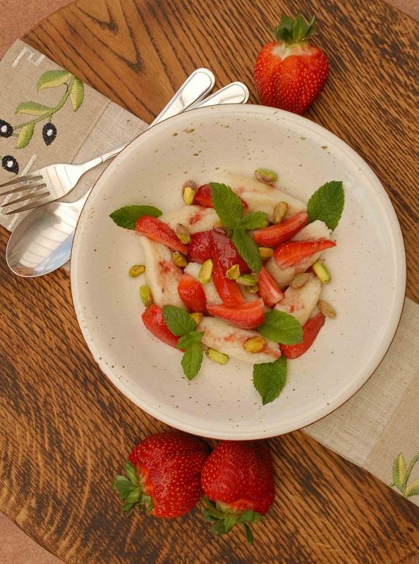 Wiele lat temu (aż boje się policzyć jak wiele) po szkole czasem odwiedzałam moją przyjaciółkę. Byłyśmy wtedy pod opieką jej babci, która przygotowywała dla nas domowe smakołyki. Kiedy byłyśmy naprawdę głodne wystarczyło jedno słowo a kilka chwil później na stole stały talerze z leniwymi kluskami z kaszy manny. Świeżutkie gorące babcia polewała smażoną bułeczką i posypywała cukrem. Dziś przypomniało mi się to danie i przygotowałam je dla swoich dzieci. Korzystając z sezonu truskawkowego zamiast bułki tartej podałam je z truskawkami i pistacjami.