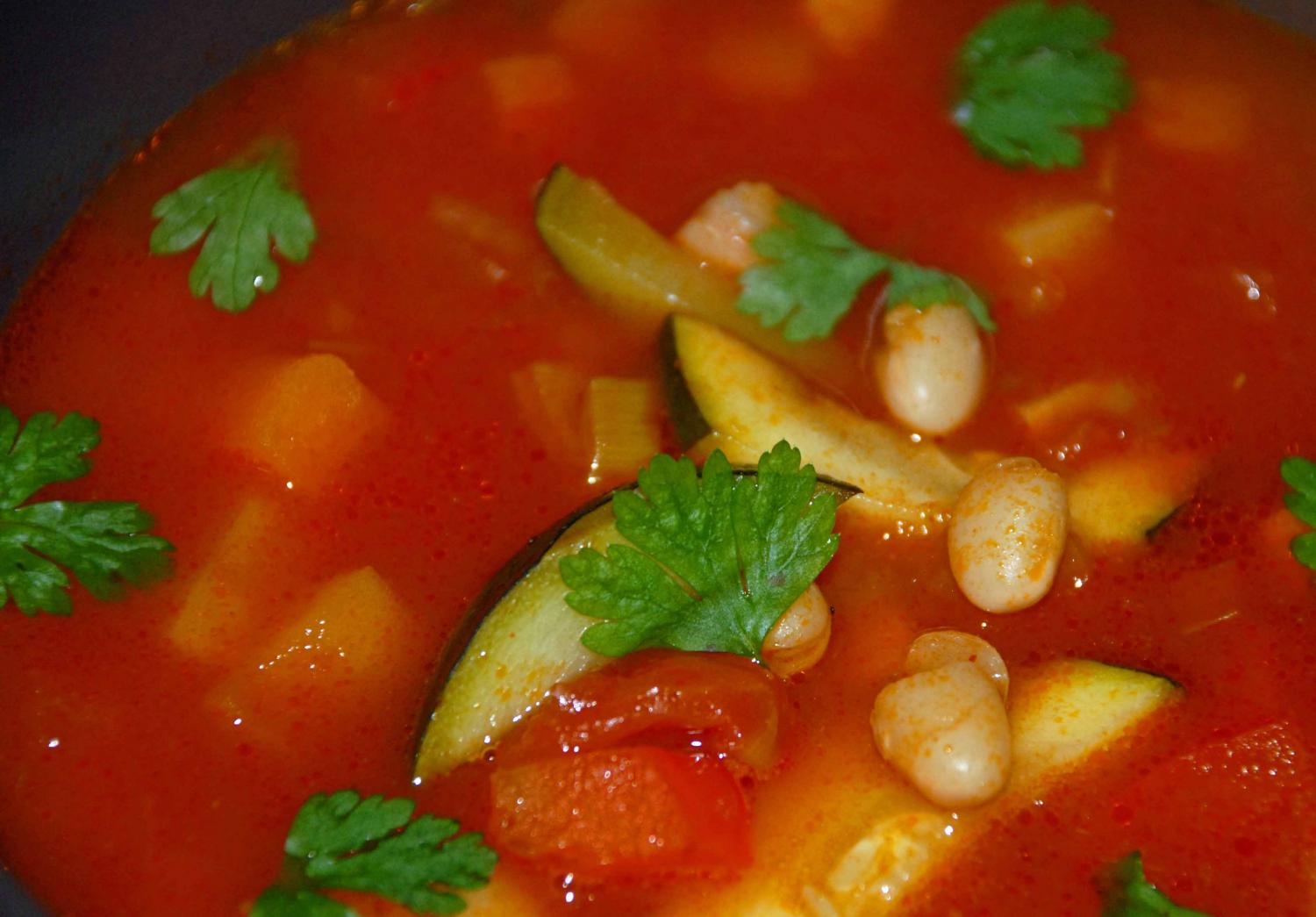 Boczek pokrój w kostkę i smaż na patelni, żeby wytopić tłuszcz. Cebulę, czosnek, marchewkę, pietruszkę, seler pokój w kostkę, wrzuć na patelnie i smaż parę minut. Zalej bulionem dodaj listek laurowy, ziele angielskie i gotuj przez 10 minut. Dodaj pomidory, dopraw dwoma rodzajami papryki. Gotuj kolejne 5 minut. Świeżą paprykę i cukinię pokrój w paseczki i dodaj do zupy wraz z fasolą z puszki. Gotuj jeszcze dwie minuty, żeby papryka i cukinia pozostały jędrne i chrupiące. Dopraw, jeśli potrzeba, solą i pieprzem. Wlej do miseczek. Obficie posyp listkami pietruszki.