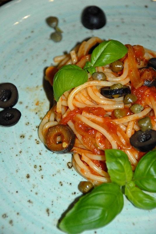 Spaghetti lubimy wszyscy. Zdecydowanie najbardziej z pomidorowym sosem. Kiedy jednak po raz kolejny miałam zrobić spaghetti bolongese moja miłość do tego dania stała się jakby mniejsza. W końcu przecież nawet najbardziej ulubione danie może się znudzić. Tym razem klasyczny neapolitański sos wzbogaciłam filetami anchois, kaparami i czarnymi oliwkami. Powstała więc moja wersja spaghetti alla puttanesca. "Alla puttanesca" dosłownie oznacza "tak jak go przyrządzają prostytutki". Legenda głosi bowiem, że danie to neapolitańskie prostytutki podawały swoim klientom aby odzyskali siły.