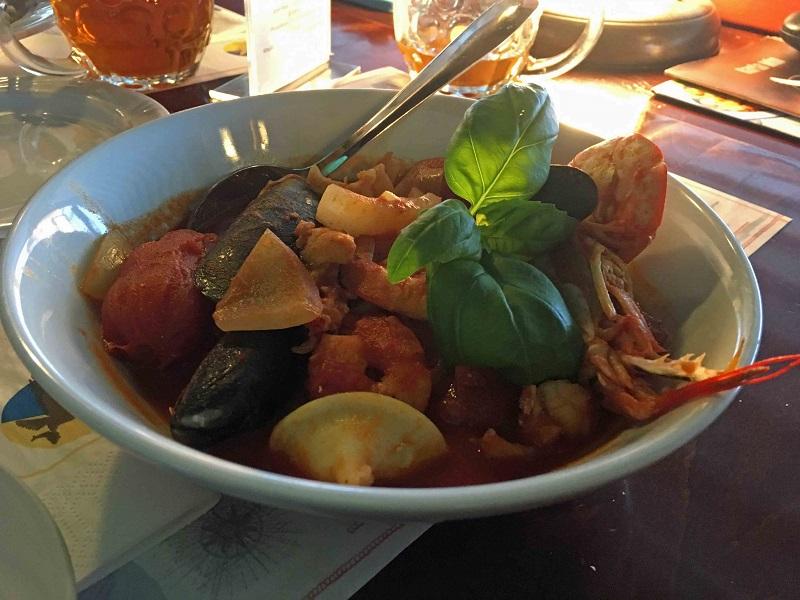 Moja córka rozkoszowała się pierogami z homarem. Nieduże, dobrze doprawione, wyglądały tak smakowicie, że przez moment żałowałam, że ich nie zamówiłam. Tylko przez moment, bo za chwilę dostałam swojego ukochanego halibuta z czosnkowym masłem i sporą porcją szpinaku i już nic więcej nie było mi potrzeba (poza kawałkiem cytryny, oczywiście). Mojego męża skusił gulasz z ryb i owoców morza, w którym skąpane w pomidorowym sosie znalazły się krewetki, małże, kalmary, kawałki ryb i ośmiornicy. Czosnkowa grzanka wspaniale do niego pasowała. Każdy z nas znalazł więc w menu to, co najbardziej lubi i nie był rozczarowany.