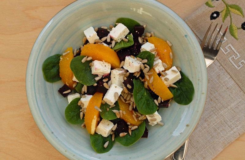 Ja jedną z pierwszych wiosennych sałatek przygotowałam ze szpinaku, pieczonych buraków, sera feta i pomarańczy. Sos z oliwy i soku z pomarańczy oraz pestki słonecznika, były do niej doskonałymi dodatkami.
