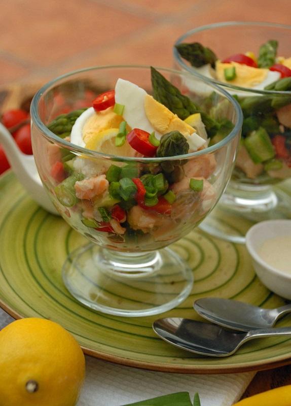Łososia pokrój w sporą kostkę i ugotuj w bulionie z listkami laurowymi i zielem angielskim. Szparagi ugotuj al dente i pokrój w 1,5cm kawałki. Ogórka, paprykę pokrój w kostkę. Jogurt wymieszaj z majonezem i chrzanem. Wymieszaj ogórka paprykę i szparagi. Dodaj sos chrzanowy i wymieszaj. Dodaj kawałki łososia i szczypiorek i delikatnie wymieszaj. Nałóż sałatkę do miseczek. Podaj z jajkiem i resztą szczypiorku.