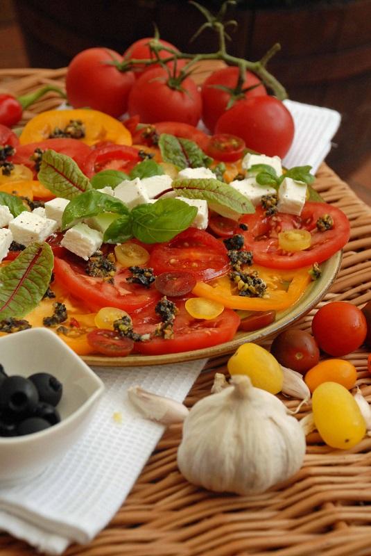 Pomidory umyj i pokrój w cienkie plasterki. Ładnie poukładaj je na talerzu. Na pomidory nałóż pastę oliwkową. Skrop oliwą. Ser feta pokrój w kostkę i poukładaj na pomidorach. Dopraw solą i pieprzem. Udekoruj listkami bazylii.